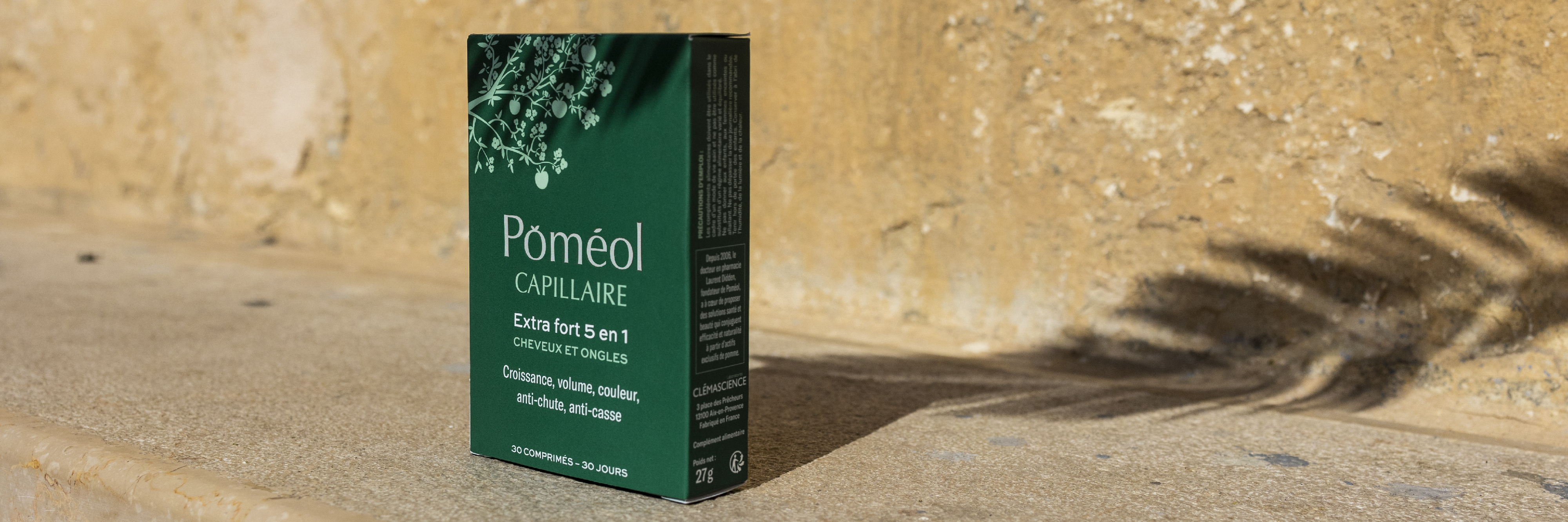 Le complément alimentaire Poméol Extra Fort Capillaire 5 en 1, à l’efficacité cliniquement prouvée, stimule la pousse et freine la chute.