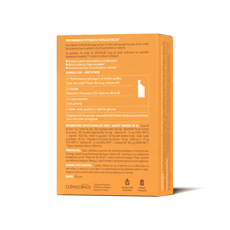 De plus, VitalPulse Coup de fouet permet également de limiter les coups de fatigue en agissant sur votre récupération après l'effort ! Idéal pour les périodes de sollicitations sportives, les besoins de mémorisation ou concentration intenses ou en périodes de surmenage.